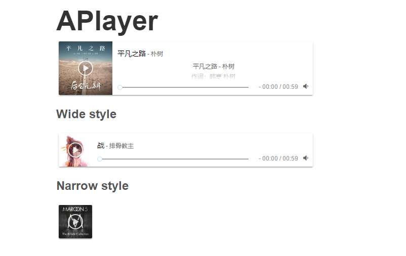 <div id="player1" title="战" author="排骨教主" pic="pics/war.jpg" src="music/war.mp3" class="aplayer"></div>