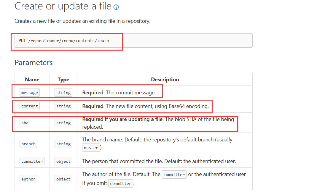 这里必需的是指定路径、message(可写死,如”.”)、content(经过Base64编码的文件内容)、sha(更新已存在文件时需要),以及授权用token